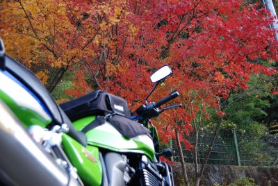 まだ真っ暗な中、走り慣れたうえぽん氏を先頭に海南高原を越えて424号に入る。車もほとんどいなくて道の貸切状態。うえぽん氏の後ろを走るのはTだったが、どうもペースがあがらない。後ろから見ていたらコーナーでもほとんどTDMが直立だ。なんとなくTから数珠つながりのまま最初の休憩ポイント道の駅「しらまの里」に到着。紅葉がとても綺麗。駐車場でTのタイヤを見て納得。前回のツーリングから「タイヤがあと少し」と言っていたが、なんとかこのツーリングまでもたせる作戦の模様。スリップサインは出ていないがこれではコーナー怖いだろう。 |