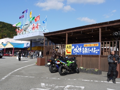 お湯につかって、お腹も満たして、すっかりまったりモードの私。廻りを見ると他のメンバーも同様な感じだ。午前中も結構走りを満喫できたのでこのまま高速道路で直帰してもいいかな・・・と一瞬チラッと頭によぎったが、企画部長Tから思い掛けない連絡。「とみきち親子がこちらに向かっている」との事。これで俄然皆走行モードに戻る。予定通り御坊で降りて煙樹海岸〜白崎海岸を廻る事になった。