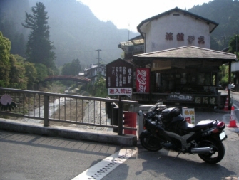 朝早いので、観光客は誰もいなかった。森の中、静かな村の空気は澄んでいて気持ちが良い。 バイクを止めると、橋の横の店からおばちゃんがトコトコ出てきた。 「文句言われるのかな?」 と身構えると、おばちゃん 「橋の横は駐車違反になるから、うちの店のとこに置いておき」 と言い残してまた店の奥に戻って行った。 なんとも温かい言葉。バイクに乗っていて歓迎される事などあまりないので、素直に嬉しかった(もっとも、こんな朝早くに田舎でバイクが駐車違反を切られる事など、ないと思うのだが・・・)。