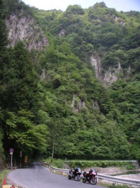上野ICからは道は良いのだが交通量が多く、ここからは飛ばさずに久しぶりに隊列(といっても2台だが)を組んで走る。 名張から名張曽爾線に入ってしばらく走ると、左手に見える川が非常に綺麗で自然とアクセルを緩めて走った。 青蓮寺ダムから5分程走ったところでTがバイクを停めた。 「ここは香落渓。三重の耶馬溪と言われてるんや」 との事。 確かに良い眺めだ。 しばし休憩を取る。