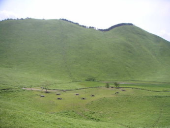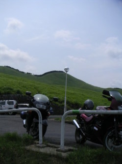 バイクを停めて、カルデラの草原に登っていく。静かで空は青く緑深く、空気も澄んでいて公私のストレスや疲れもいっぺんに飛んでいってしまいそうだ。 体験学習で来ている小学生の団体がカルデラの草原を散歩しているが、まだ朝も早いので観光客はまったくいない。 亀の湯温泉が開くのは11時。Tのスケジュールにしては珍しく(?)余裕のあるスケジュール。 いつもは却下される昼寝も今日ならば文句もあるまい。 前日の睡眠時間は3時間ちょっとだったので、カルデラの真ん中のベンチに横になって、ひとときの昼寝を楽しんだ。