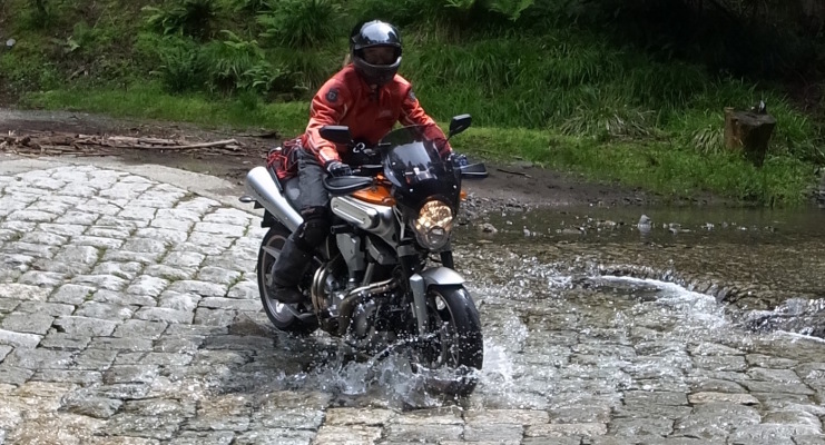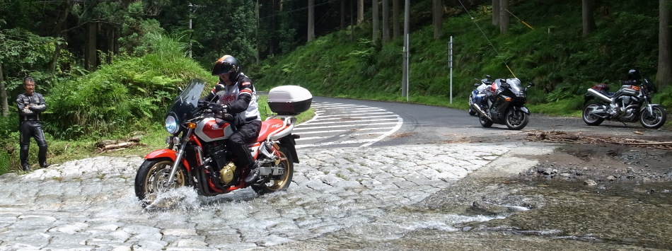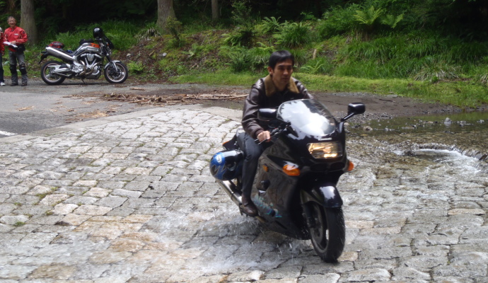 最後に渡ったのはRip氏。一人余裕のカメラ目線。他のバイクよりも水しぶきが大きいのは車重のせいか?
