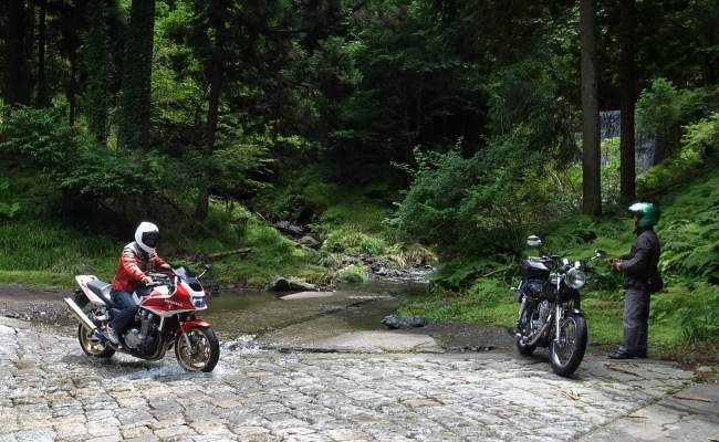 静かな山間の小道に突然現れるこんな場所。予想以上に水量が多く、しかも道は石畳で渡るのに躊躇する。先陣を切ったのはマッチン氏。
