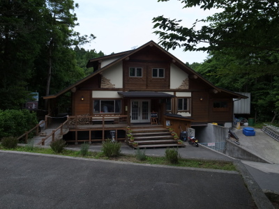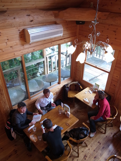 | たまたま交差点で見つけた看板を頼りに寄ったのが「フィッシング サンクチュアリ」。あまり期待せずに行ったがログハウスのカフェは居心地も景色良し。店員の女の子も可愛いとあって、思いがけない発見であった。ここはこっち方面のツーリングコースの基点にできそうだ。店で1時間程かけてゆっくり昼食を取る。こたやん氏はまだ鞍掛峠の余韻が冷めないようで、「交差点まで下った時思わず引き返そうかと思った程でしたよ」との事。昔は峠小僧だったらしい。 |