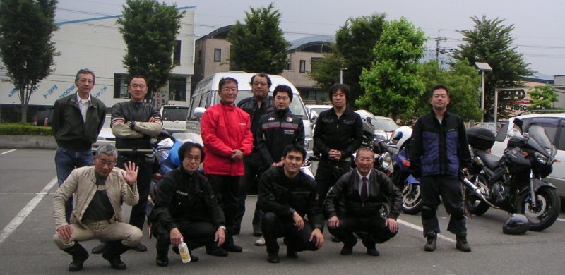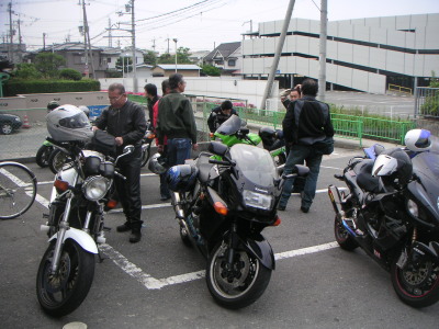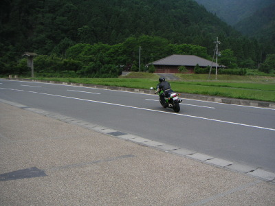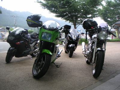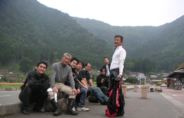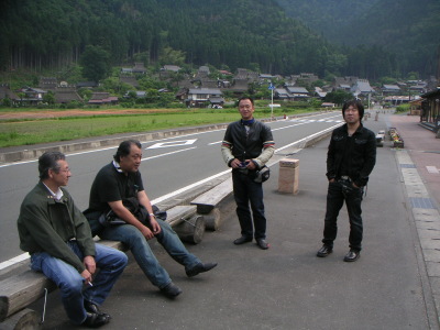 皆ワインディングを満喫して笑顔。空もだいぶ明るくなっていて、なんとかもちそうな気配。企画部長と行程の相談をする。風呂をやめて行程を前倒しすれば、当初スケジュール通りでもなんとかもつかもしれない、との見解。但し早めに帰りたい人もいるし、美山町を観た後ここで一旦解散しようか?という話をしていたら、黒隼氏「8時過ぎに解散の話をするツーリングクラブって・・・」