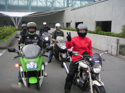 | 急遽参加表明の一人、とみきち氏(←左端)。何と革ジャンの下はシャツとネクタイ。亀岡まで一緒に走り、そのまま会社に出社されるとの事。今日とみきち氏のお店に来たお客さんは、誰も朝のとみきち氏の姿を想像する事ができないだろう・・・。スーパーマンのようなお人だ(笑)。 Rip氏もGPZ900Rにお乗りの職場の方と一緒に急遽参加。この方、なんでも1ヶ月前にご結婚されたとの事。まさに新婚ほやほや。こんなおじさん達のツーリングに参加していて大丈夫なのだろうか!? もう一人初参加は私と同じバイクに乗っているちょび氏。前々からメールでやり取りしていたのだが、前日急遽参加表明があった。実はちょび氏とは2年前の”信楽朝駆けツーリング”の朝、お話した事があった(お顔観るまで忘れていた、すみません・・・)。あの時またご一緒しましょう、と話したが、2年越しにかなった訳だ。 |