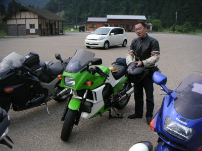 道の駅から茅葺屋根の里に移動。この間、ヤッシャー氏にZX-11に乗って貰った。以前蒜山で乗って貰った時は「怖くて乗れない」と言われたのだが、今回は「自然に乗れました」とのお言葉を頂いた。私も蒜山の時と比べて違和感無くヤッシャー氏のGPZ900Rに乗れたから、サスペンションを交換・調整してZX-11の不自然な状態は解消されたのかもしれない。リアサスペンション、交換して良かった〜!!