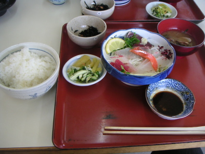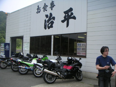 | 残りメンバー5名は、ren氏お勧めの食堂「治平」でちょっと早い昼食を取る事にする。バイクを停めて暫し景色に見とれてしまった。 お勧めの刺身定食は¥1,150−也。新鮮でボリュームもあり満足。 結局、久しぶりのツーリングにまだ走り足りない私と黒隼氏は、Rip氏・新婚忍者氏と一緒に朽木方面を廻る事にした。ren氏とはここでお別れ。 |