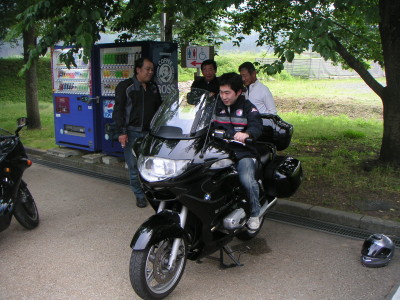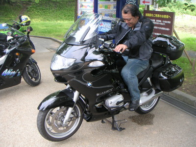 その後熊川宿の中を素通りし、国道367号・鯖街道に折れて南下する。12時を過ぎてさすがに交通量が増えてきた。道は悪くないが朝のようには追い越ししながら走る事は難しくなった。1時半過ぎ道の駅「くつき新本陣」に到着。駐車場に1台のBMWが停まっていた。地元滋賀県の人で、話込むうちに、Rip氏、新婚忍者氏、黒隼氏が跨らせて貰っていた。あのハヤブサが400ccに見える黒隼氏、BMWだったらちゃんとリッターバイクに見えますよ!