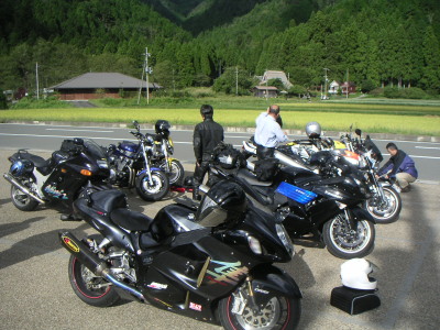 | 午前5時、真っ暗闇の中を第1集合の「道の駅能勢」目指して出発。阪神高速堺線〜環状線〜池田線と淡々と歩を進めます。池田木部ランプを下りる頃には随分と明るくなっておりましたが、進行方向に大きな黒い雲の塊が・・・(汗)。途中でミミオを捕捉し、ランデブー走行。雨男の仕業か、予想通り雨がポツポツ落ちてまいりました。 第1集合には、私ケロリン、ミミオ、黒隼さん、Ripさん、はるさんに加え、お見送りの丸さんが集結。皆さん早朝からお好きでございます(笑)。 |