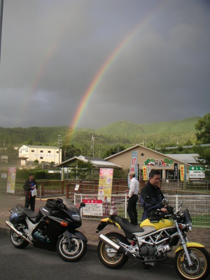 とりあえず雨もやみ・・・。6時30分、丸さんのお見送りを受け、腹痛を起こしたミ○オをホッチッチにして、R173を北上開始でございます。ところどころで雨にやられながらR173〜R9〜R27〜r12〜R162を走行し、1時間と10分ほどで・・・