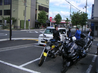 | 昼食が終わった段階で、12時30分でございます。ここでrenさんと黒隼さんが離脱。丹後半島の「民宿ren」にて一泊のご様子。うらやましい・・・(笑)。残り4台はおとなしく大阪へ帰ります。 (←西友駐車場。奥の建物が西友) |
