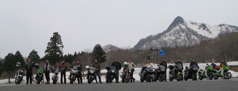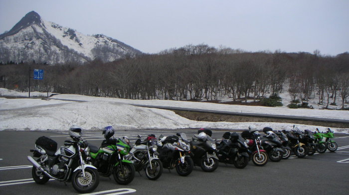 高速ワインディングなのであまり登っている印象はないのだが、実は大山の標高は1700m。鏡ヶ成近くの象山でも1000mある。後半からは道の両側に雪が積もっていた。 |