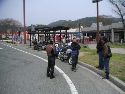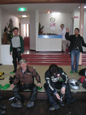 バイクの前では朝からディープなバイク談義に花を咲かせるメンバー達。バイクに乗らない人には理解できない光景だろうなあ・・・。と言っても今回宿は結局私達RYUBEで貸切できたので、一般人から変な目で見られる心配はない。精算は一人2食+2次会費用含めて\4,500-と格安。毎度ながら本当に良い宿だ。