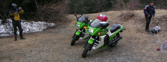 大阪のヤッシャーさん(写真左)と、九州のわかぱさん(写真右)は同じGPZ900Rのライムグリーンという事で意気投合。確かに珍しいカラーリングのバイクが2台並ぶと絵になる。この後大山周回道路でもライムグリーン2台でのランデブー走行をしていた。