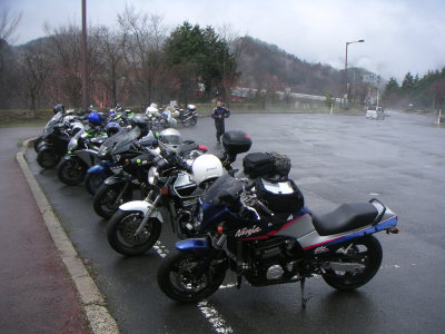 | 高速走行はいつもの通り、皆バラバラで走る。相変わらず先頭をかっ飛んで行くのはスギさんと黒隼氏。舞鶴道との分岐を越えた辺りから車も空いて、テンポ良く進む事ができた。勝央SAで休憩。若干の時間調整をして、集合場所の東城まで一気に走る。「道の駅東城」には予定より若干早い10時前に到着。ここで九州を待つ。 到着後、九州幹事子忍者君に到着済みのメールを送る。返信は「今PAでカッパ着ている」。22km手前までは来ているそうだが、雨とは・・・。20分後、九州が無事到着。今回九州はバイク13台+車1台。一時は大阪の方が台数が多い時もあったのだけれど、今はすっかり立場逆転。 |