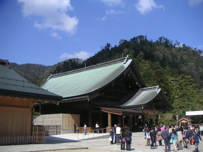 | 出雲大社の駐車場に到着すると、カッパを干した先行メンバーのバイクが停まっていた。予想通り、先行グループは「三刃屋のローソン」が見つけられず、そのまま出雲大社に向かったとの事。既に食事と大社参拝を済ませた模様。 私達も遅ればせながら、食事をして出雲大社参拝をした。出雲大社は本殿は改修中。仮殿での参拝となった(←写真)。仮殿でもなんとも立派な建物。ここにきてようやく晴間が見えてきた。 駐車場に戻り大阪・九州両幹事が打ち合わせ。雨の中の走行で疲労したメンバーが多いとの事で、主要メンバーは海岸沿いの農道をパスして、蒜山高原直行する事になる。行程通り農道を走る元気な別働隊は、大阪のとみきち氏、黒隼氏、すぎさん、そして九州のまっきーさんの4台。また、ここで九州のわかぱさん@ZXRは単騎九州に戻る事に。お気をつけて・・・。 |