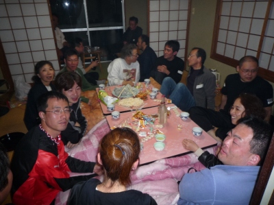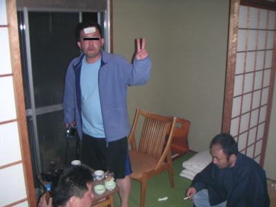 | 夜も更けてきて、挙動不審な男が出現。名札貼る場所の判断が麻痺している。私はできるだけ目を合わさないようにしていたが、次の日この男の名札が私のセーターの背中についていた。酔うと悪態が非常に迷惑なのは昔から変わらない。 部屋の反対を見ると、姫が本領発揮「隊長!飲め〜!!」と温和な隊長を捕まえてご機嫌である。夜も更けてきて、気がついたら二次会部屋で寝てしまっていた・・・。 |