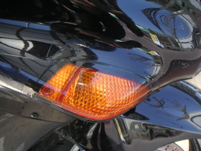 | 雨と言えば九州の姫さんだ。久しぶりに”雨の姫”の走りを観てみたい。「道の駅 おろちループ」からは姫さんの後ろを走らせて貰った。姫・私・まー坊さん@ハイラックサーフの3台で北を目指す。交通量が多かったので都井岬の時のような豪快な追い越しこそ観られなかったものの、雨の中でも安定したさすがは姫さんの走りであった。 深野辺りでトラブル発生。走っていて前方右手で何かブランブランとしている。なんと右ウィンカーがが取れて、かろうじてハーネスで繋がっている状態。あわてて路肩に停車。早期発見したので、ウィンカーは生きていた。まー坊さんがすぐに近くのコンビニまで補修テープを購入しに行ってくれた。黒テープで貼ったら違和感全く無し(←写真)。まー坊さん、助かりました! |