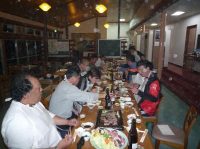 何はともあれ、全員無事(?)到着。改めて乾杯をして、ジンギスカンをたらふく食べて、ビールを飲んで・・・。瓶ビールが35本空になったとの事。1次会から皆さん全開。 |