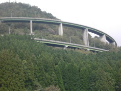 人吉からは国道221号線にスイッチし、人吉ループ橋、えびのループを超えて宮崎県へと突入する。えびのループを下った「山椒茶屋」まではフリーとのこと。Mr.Tも3番手くらいで食らいついていくが、結構なスピードである。しかしながら気分爽快!美しい風景に快適な道路・・・。まだまだバイク乗りはやめれまへんわ・・・(笑)。 ←えびのループ(帰路に宮崎道のえびのPAから撮影) |