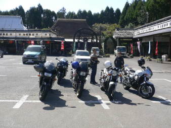 山椒茶屋で小休止の後、今度はストリームを先頭に霧島連峰を目指して山道を駆け上がる。結構タイトなワインディングが延々と続くが、ストリームは結構なスピードで上っていく。そして我がGPZ1100も大きくて重い車体にもかかわらず、軽快にクリアしていく。雑誌等にはGPZ1100はワインディングがイマイチ・・・等々の記事が複数掲載されていたが、長いホイールベースと内に切れ込むハンドル特性のせいで体感Gが少なめなだけで、実際には結構な速度でコーナーをクリアできる。前の愛車・EX−4もコーナリング性能はずば抜けていたが、扱いやすさからすればむしろGPZの方が上かもしれない。 ←山椒茶屋にて |