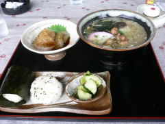 時間は13時、昼食である。とりあえず近くにあった「ごろん亭」という手打ちうどんの店に入る。店は川に面しており、景色がとてもよい。そしてよかったのは景色だけではない。注文した「地どりうどん定食」は極めて絶品!大阪や四国以外で食べたうどんがおいしいと思ったことは初めてかもしれない。カツカレーを食した他の方からも絶賛の声。「大当たり」の昼食であった。 |