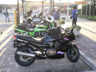 5時35分、ゲートが開いて船外へ。ついに念願の九州上陸である。フェリーの外では銀たこ氏が出迎えてくださった。約半年振りの再会の感激に浸る前に、銀たこ氏は「Mr.T、掲示板に書きこんどった秘密兵器ってこれね!」愛車GPZ1100を指差して目をまんまるにしている。してやったり・・・(爆)。