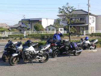 Mr.Tを含めた残りのメンバーは九州道をひたすら南下していく。子忍者氏を先頭に概ね130巡航。線形もいいしアップダウンも少ない上、我が新しい相棒にとっては一番得意とする速度域なので快適そのものである。正直EX−4への未練がなかなか断ち切れなかったのであるが、ここへ来てようやく吹っ切れたような気がした。 8時10分、九州道・八代ICを下り、国道219号線へスイッチ。途中のコンビニで最初の休憩を取る。ここでお姫様のバイクに異変を発見!何とリアタイヤにピンが刺さっている。しかしながら幸いなことに見たところ大きなピンではなく、空気も抜けていないのでとりあえずそのまま走行することになった。RYUBEのツーリングにトラブルはつきもの(?)これからどんな関門が待ち構えているのか・・・。 ←八代のコンビニにて |