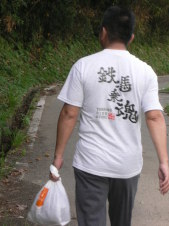 夕食は温泉施設のレストランで18時からということで、その前に温泉でひと風呂浴びることとする。皆で近くて遠い道のりをブラリブラリと歩いてゆく。 今日の男湯は「メダカ浴」。深さ1.1メートルの深い温泉浴槽が売りらしい。浴室自体はスー銭風で大してめずらしいことはなかったが、お湯が特徴大アリ!泉質的には「重曹泉」なのであるが、成分が非常に濃く、半端じゃなくヌルヌルなのである。湯船に浸かった時はもちろんのこと、何とカランからもこの温泉が出るので、シャンプーで洗髪して頭をゆすいでも、シャンプーが本当に流れたのかどうかがわからないほどヌルヌルなのである。「えーい!うっとおしか〜!」とかんしゃくを起こしていた方がRYUBEメンバーの中に約1名いた(笑)。 ←温泉へ向かうの図。写真は忍者親分。着てはるTシャツいいなぁ・・・。大阪も導入するか? |
