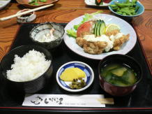 浴後は待望の夕食である。とりあえず刺身をアテに生ビール(忍者親分は健康ジュース)で喉を潤す。夕食のメインは宮崎名物の「チキン南蛮」。何やら妙に衣が甘いがこれはこれで美味。おいしいものを飲み食いしながらバイク談義等々に花が咲いた。 ←噂(?)のチキン南蛮。なかなか美味だった。 |