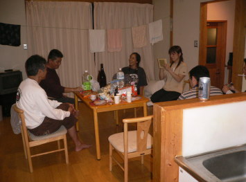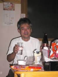日付は変わって10月2日午前4時半。何やらダイニングで怪しげな音がする。気のせいかと思い、30分経過。しかしながらそれでも音が消えないので覗きにいくと、すでに忍者親分、おさむ氏、花ちゃん氏が起床し、忍者親分はお決まり(?)のテレビショッピングを見ながら何やらダベッていた。 そしておさむ氏の手には焼酎の水割りグラス。聞くところによるとその前にビールも飲んだと・・・。いやはや恐れ入った(爆)。Mr.Tもその輪に加わり、シラフでお付き合い。そうこうしていると子忍者氏も起き出してきた。時刻は5時30分、ようやく外が白みかけてきた。外を見ると、あたり一面濡れている。夜中に結構な雨が降った模様である。 ←朝から酒を食らう猛者。ちなみに撮影時刻は5時19分(笑)。 |