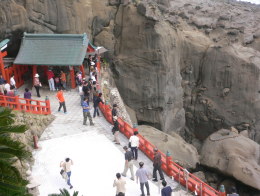 小休止の後、さらに日南海岸を北上する。今日も天候が不安定で、時折ゲリラ雨に襲われるがこれがかえって気持ちいい。11時、無事に鵜戸神宮に到着した。ここで最後の観光をする。 鵜戸神宮は日向灘に面した海岸沿いにある一風変わった神社である。詳しいことはよくわからないが、どうも安産かなんかの神様であるらしい。ここでは子忍者氏にすすめられ、「運玉」なるものを投げてみた。もう少し詳しく記すと、神社境内の崖下に大きな岩があり、真ん中にくぼみがある。そのくぼみに投げた運玉が入るといいことが起こる。男性は左手で、女性は右手で玉を投げるべしとある。ちなみに玉を投げるポイントからくぼみまでは直線距離で約10メートルである。 ←「運玉」投げの現場。右ナナメ下にあるのが「くぼみ」。 |