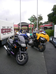 14時過ぎ、他のメンバーより数分遅れでえびのPAに到着。銀たこ氏から子忍者氏に入ったメールによると、福岡地方は雨とのこと。「あんれま・・・天気予報嘘つきやん?」と言ったところで雨は止むはずもなく、素直に諦めて雨対策を強化する。 さて、えびのPAを出た次の休憩ポイントは広川SA、すなわち解散地点である。距離にして約150キロ、この区間もフリー走行となる。子忍者氏に続く2番手で、人吉、八代、熊本・・・・とおおむね140〜150でぶっ飛ばす。それにしても愛車GPZ1100、タフですわ・・・。さすがはツアラー!快適快適・・・(喜)。 ←えびのPAにて |