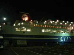 乗船手続きを済ませ、乗船待機レーンへ。18時30分、早くも乗船。愛車は右舷中央のバイク用スポットにしっかりと固定された。 帰りの足は平成14年就航の「フェリーきょうと2」である。何でもオリエント急行を手がけたプロデューサーが内装を手がけたとか。自ずと期待が膨らむ。 ←帰りの足「フェリーきょうと2」 |