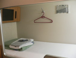 帰路も12時間の長旅ゆえ、行きの「やまと」の「2等指定A」と同クラスの「特2等洋A」をチョイス。この船もさぞかし素晴らしかろうと思いきや、何とカプセルホテル様のテレビのついた寝台であった。 「あんれま・・・」と思いながらもさっさと部屋着に着替えて船内を探検。確かに内装は素晴らしいが、行きの「やまと」と比べると格段にレベルが落ちる(これでも国内フェリーとしてはかなりのハイグレードであるとは思うが・・・)。一通り船内を巡ったところで展望風呂へ。こちらは文句なし!生き返るわ・・・(喜)。 ←「特2等洋A」。国内フェリーのキャビンとしてはかなりレベルは高い。 |