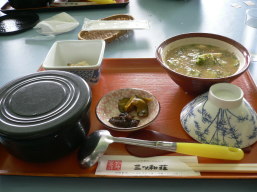 5個の運玉を手にしたMr.T、何と2球目の玉がくぼみに命中した!どんないいことが起こるんやろうと心待ちにしているが、今のところ思い当たるフシはない(笑)。 参拝を終えたところで時刻は11時30分、少し早いがお昼にする。お土産物屋の2階にある、修学旅行生やらツアー客やらがお昼を食べていそうな食堂で「冷や汁定食」を食す。これもまた美味。丸く言えば「冷たいネコ飯」なのだが、シソの実ときゅうりがとてもいい味を出している。ちなみに忍者親分と子忍者氏はきゅうりがお嫌いらしい。意外な事実である。 ←冷や汁定食。素朴だがなかなか美味だった。 |