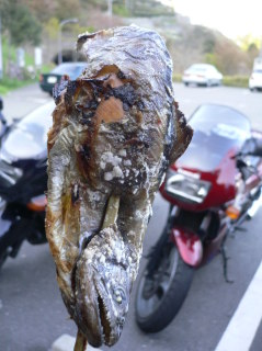 16時45分、道の駅・布施ヶ坂到着。敷地内に足を踏み入れるとプ〜ンと香ばしい香りが漂ってくる。慌ててバイクを止め、匂いの発生源へ。そこにはおでんやらたこ焼きやら「アメゴ(関西で言うアマゴ?)」の塩焼きやら地鶏の串焼きがずらりと並んでいた。 とりあえず「アメゴ」の塩焼きをオーダー。すると気前のよい店主、「1本おまけ」と言って特大アメゴを2本くれた。1本食べたら十分故、もう1本は女性陣におすそ分けする。気がついたらメンバー皆がわらわらと集まってきて各々好きなものを口にしている。そんな中で地鶏を頬張っている方が複数。あまりにうまそうなのでMr.Tも1本呼ばれることとした。口の中に地鶏の香ばしい風味が広がる・・・。うまいのぉ・・・。至福のひとときであった。 ←特大「アメゴ」の塩焼き。この味は一生忘れないだろうと思うくらいうまかった。 |