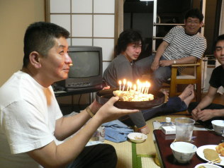 時刻は20時30分過ぎ。風呂に入り、一息ついたところで乾杯の仕切り直しである。忍者親分さんが翌日に誕生日を迎えられるということで、蒸しパンにろうそくを立ててお祝いをする。その後も楽しい宴は続き、愛媛名産のじゃこ天、Mr.Tが遠路神戸から運んできた鯖寿司等々を肴に、子忍者さんが銀凧代行幹事に託した焼酎をいただく。酒がこんなにうまいとは・・・。苦労してやってきた甲斐があったというものである。 そうこうしているうちに夜も更け、日付が変わる頃に宴はお開きとなった。 ←忍者親分さんの誕生日を蒸しパンで祝う。おめでとうございます。 |