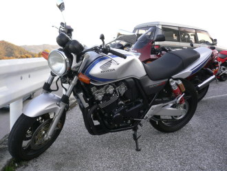跨った第一印象は「意外とコンパクトやね」といったところ。実際動かしてみると、普段高回転型のパラツインに慣れ親しんでいるせいか、クラッチミートのタイミングがなかなか掴めない。しかし、この点は数回発進と停止を繰り返す中で何なく克服した。さて、いざ公道へ。アクセルを開けるとリニアに伸びていく車速、コーナーでは軽くバンクさせるだけで理想のラインをトレースする・・・。また、各ギアの守備範囲も結構広く、非常に扱いやすい。そりゃ売れますわなこのバイク・・・。これはツーリングでは楽やろうなぁ・・・という思いが80%、EX−4みたいにもう少しやんちゃな方が・・・という思いが20%というのが率直な感想であった。数年後、Mr.Tの愛車は何になっているのだろうか? ←おさむさんのCB400SF。さすがベスト・オブ・ネイキッド。1992年のデビューから着実に完成度を増している。 |