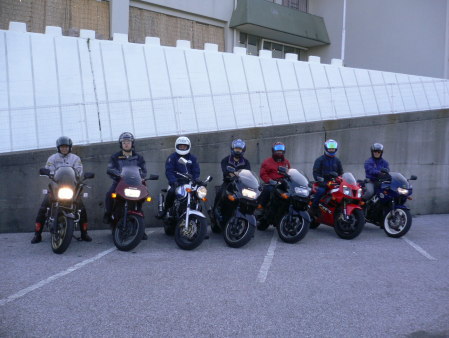 7時過ぎに朝食を終え、7時50分に玄関下に集合、皆で記念撮影をした。前夜の段階では、おさむさんは所用のため、ここから単騎で松山に向かうことになっていたが、結局は他の九州メンバーと一緒に高速経由で松山に向かうことになったようである。我々大阪メンバーも大歓迎!高知道・馬立PAまでは前日と同様、バイク7台+車1台で走行することとなった。 ←バイク7台での記念撮影。とてもいい思い出になった。 |
