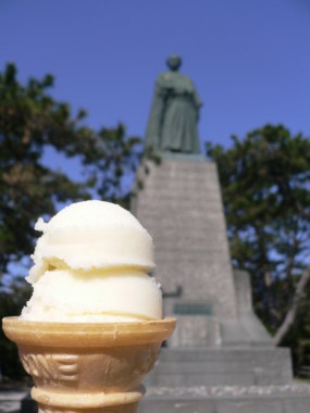 8時10分、桂浜へ向けて出発。ここから桂浜までは、右手に雄大な太平洋を望む絶景ルートである。地元のノロノロ車が頻繁に現れては消えていくが、絶景ゆえ特に気にならない。30分ほどで桂浜に到着、駐車場にバイク・車を止めた。 桂浜で忘れてはならないのが「坂本龍馬像」と「アイスクリン」である。坂本龍馬像を仰ぎ見ながら食べる、3段重ねのアイスクリンは特別おいしく感じた。 ←坂本龍馬像とアイスクリンのツーショット。 |