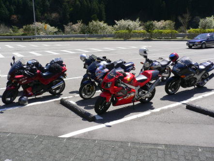 馬立PAに到着した7台のバイクと1台の車。皆でワイワイ盛り上がり、最後のひとときを楽しむ。犬のKARINちゃんともここでお別れ。わかっているのかどうかは定かではないが、どこか寂しそうにしている。ここで忍者親分さんから「今度ぜひ九州へも」とのお誘い。大阪から別府まではフェリーで一晩、おまけにMr.Tには熊本に親戚がある。ミミオを置いてでも行ってしまおうかとマジで思う。九州メンバーの皆さん、そのときはぜひともよろしく・・・(笑)。10時45分、また来年の再会を誓って解散式終了。再び高速本線に戻った。 ←馬立PAにて。 |