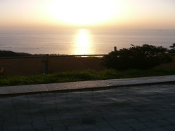 日付は変わって4月17日5時45分、起床。幸いにも前夜の酒は全く残っていない。酔いが回るのもさめるのも早いのがMr.Tのいいところ(?)である。起床後風呂道具を持って前夜の展望露天風呂へ。時間は11時からとなっているが、前夜からのスタッフの対応等へのフラストレーションを引きずっているMr.T。そんなものはお構いなしである。幸い浴室には施錠も何もされていない。浴槽には保温用のフタがしてあったが、片っ端からはぐってドボン。そんな破天荒なことをやらかすのはMr.Tだけかと思いきや、後から何名か入浴客が現れた。お湯はぬるめであったが、太平洋から登り来る朝日を眺めながらの朝風呂は格別であった。 ←展望露天風呂から太平洋を眺める。絶景。 |