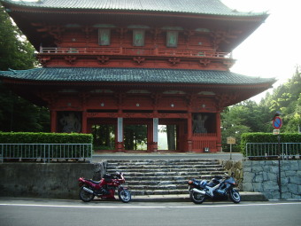 高野下駅を少し過ぎたあたりでミミオが減速、私に先に行けと言う。「なんでやろう?」と思っていたのだが、数キロ走ったところで道が一変。一応2車線あるのだが、タイトコーナーが連続する厳しい山岳路へと突入した。ミミオZX-11はその重さが災いしてこのような道は苦手なのである。一方、私のEX-4は車重が軽く、もともとのコーナリング性能も高いので、4速ロック、荷重移動、アクセルのオンオフのみで軽快に駆け上がっていく。私が山上都市・高野山の入り口である「大門」に到着したのは午前6時10分。気温はたった10度しかなく、寒さで催した私が道路の隅で立ち○○をし終え、ひとしきり写真撮影を終えた頃、ようやくミミオがやってきた。 |