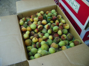 一休みの後、梅取り開始。一部は先客が収穫した後とのことであったが、あるわあるわ・・・。見る間にダンボール数箱が梅で埋まった。一区切りついたところで昼食。その間に嫁さんの従兄夫婦も一家で応援に駆けつけ、一段と賑やかさを増した。昼食後、ふと気づくとミミオの姿がない。どこへ行ったかと思うと、なんとまあ防波堤の上で昼寝をしているではないか。ガキやあるまいしと思いながら、大事なところは葉っぱで隠しておいてやった。 |