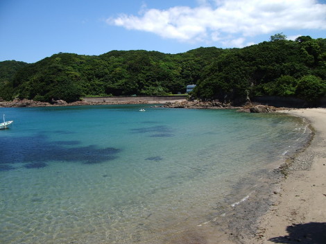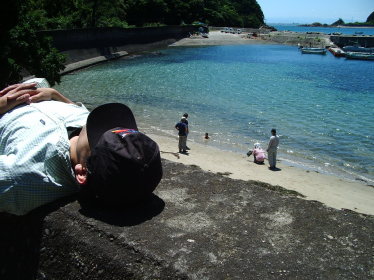午前10時10分、最終目的地へ向けて出発。ここまで来ればもう海は近い。10分ほどで国道42号線に合流、さらにそこから10分ほど走り、日高町津久野集落に到着した。ここは海あり山あり田んぼありの大変風光明媚な土地で、「ぼくのなつやすみ」という夏休み体験ゲームの舞台に非常によく似ている。すでに嫁さんの両親と祖母が到着し、我々の到着を待ってくれていた。 |