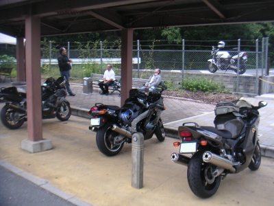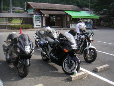 | 自宅を5時出発。空を見ても天気は良く判らない。当初予報通り午前中帰着ならばなんとかもちそうだ。香芝SAには5時半過ぎに到着。一番乗りと思ったら、バイク駐輪スペース向こうの一般道に一足早くCB1000が到着。とみきち氏は自宅がすぐ近くなので、この先香芝ICで合流するのだ。 5分もしないうちに丸さんと黒隼氏が同時到着。走りたくてウズウズしているおっさん達の集合である(丸さんは仕方無く私につきあってくれた?)。すぐに今日のコース検討。 富吉氏天気予報では、天気は夕方まで持ちそうとの事。暑いのは避ける為に山に入る、という事で黒滝〜天川村〜大塔を廻るルートに決定。私の普段の朝駆け定番を逆走するルートである。大塔辺りで再度天候判断してどうするか決める事になった。とは言え、黒隼氏と丸さんはカッパ持参で「雨は気にしない」との事。元気だね〜・・・。 |