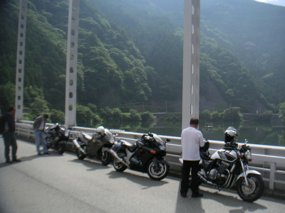 | 再び出発。次の目的地は県道53号を走ってダム湖に架かる中原橋。このコースも朝駆け定番だが意外や東から走った記憶があまりない。4台はぐれる事なくテンポ良く渓谷沿いのワインディングを走りきった。中原橋には9時15分到着。 昼前帰宅する為に、私はここでお別れして国道168号を南下するつもりでいた。が、ここまで気持ち良く走ってきて、どうしてもこの先「裏龍神コース」を走ってみたくなった。龍神スカイラインまでは30分程との事。9時過ぎなので登っても昼前帰着はなんとかなりそう。結局ついていく事にした。 |
