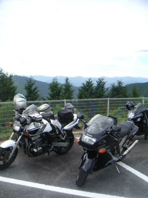 | かなり登った辺りで、突然集落が現れた。野迫川村の役場とガソリンスタンド。長く仕事で和歌山担当もした事があったが、こんな村があった事さえ知らなかった。そこから更に上がって、龍神スカイラインの横っ腹に合流。鶴姫レストンランの駐車場到着は9時45分。中原橋からはきっちり30分であった。皆満足顔。 駐車場でタイヤを見てみた。スリップサインであるビバンダム君の顔辺りまで使っていて良い感じ。もっとも他の皆さんはタイヤいっぱいいっぱいまで使っているから凄いものだ。黒隼氏「タイヤをハイグリップタイヤにしたら世界が変わるよ〜」と悪魔の囁き。 雨模様の天気予報にも係らず、続々とバイクの集団が上がってくる。オフロードの集団、SS走り屋集団、大型バイクの集団・・・・。よくこれだけのバイクが標高1000mのこんなところまで上がってくるものだ。龍神スカイライン、景色も最高の中高速ワインディングだがアップダウンがきつくて、見かけよりも難しい。私も普通に走っていて何度かヒヤッとした事がある。事故も多く無理は禁物である。 |